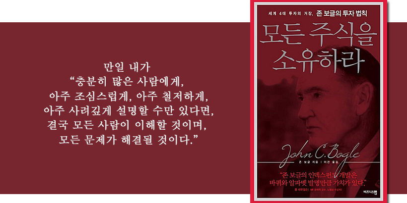 이 책은 인덱스 펀드에 투자하고자 하는 이들뿐 아니라, 직접 투자를 고려 중인 이들에게도 추천할만하다. 그가 인덱스 펀드의 원리와 장점을 설명하는 과정에서 보여주는 기존 펀드 투자 방식의 문제점들과 주식 시장의 근본적인 성질을 이해하는 것이 직접 투자를 하려는 이들에게 큰 도움이 되어줄 것일 뿐만 아니라, 인덱스 펀드 투자 방식이 갖는 근본적인 장점들 - 주식을 선별하여 투자하는 투자자가 반드시 극복해야만 하는 인간의 본성이나 시장의 구조적인 문제들 - 에 대해 생각해보는 것이 분명 경험 많은 투자자에게도 의미있는 시간이 되어줄 것이기 때문이다.