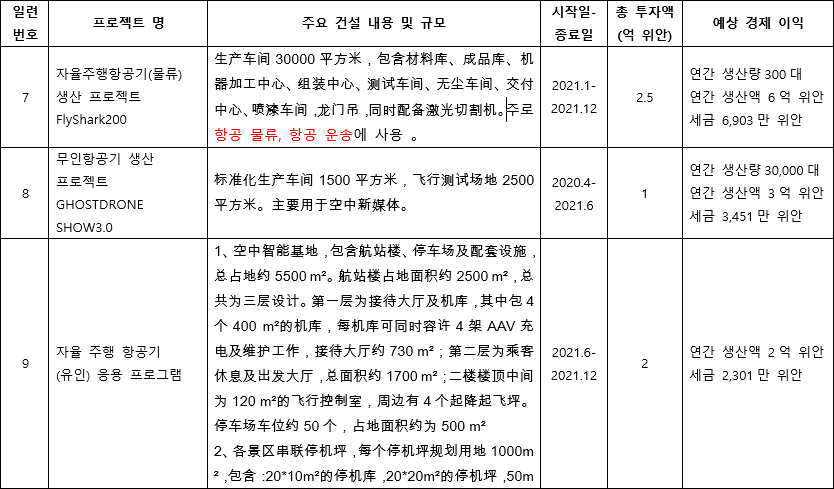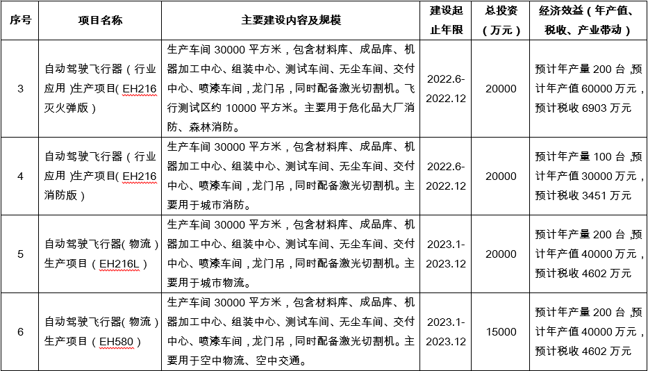종료 시기로 프로젝트를 구분하면 EH-216, FlyShark-200 모델은 2021년 말까지, 2022년에는 장거리 기체인 VT-30과 소방용 모델인 EH-216F, 2023년에는 물류용 모델인 EH-216L과 EH-580 모델에 대한 생산 지원금이 지급된다. 이항에 대한 허저우 시의 프로젝트 지원 금액은 허저우시 이항 본사건물 건설비용인 6억 위안을 포함하여 총 30억 위안, 한화로 약 5,200억원에 해당하는 금액이다. 이항에 대한 허저우 시의 프로젝트 외적인 부분에 대한 지원 사항은 '2.5.3-1 이항 인텔리전스 프로젝트(亿航智能系列项目)'에 자세히 적혀있다.