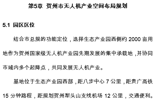 시의 기능적 위치와 결합할 수 있는 허저우 시 생태 산업 단지 서쪽 약 2,000 에이커 토지에 국가 수준의 무인 항공기 산업 단지 초기 중심지를 개발한다.
